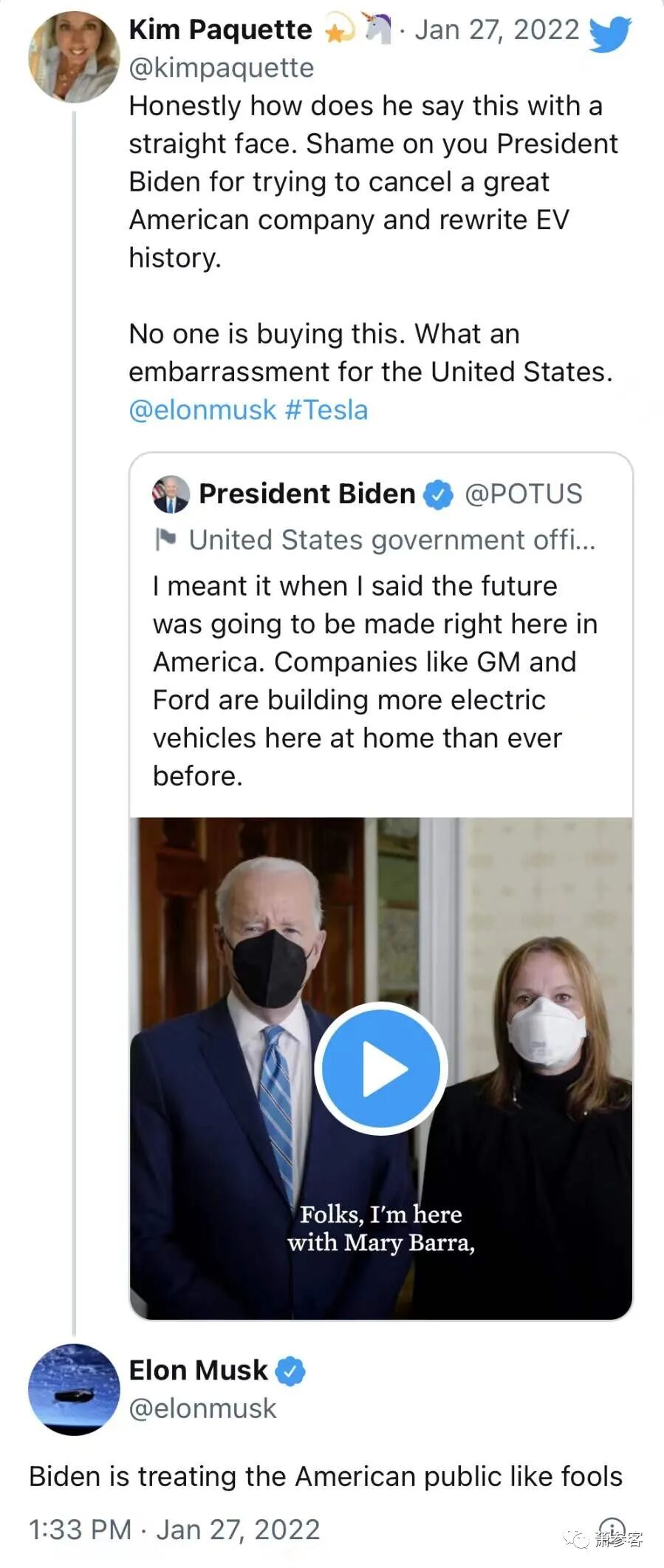首先下午1:33pm,马斯克在推特上指责拜登:"像对待傻瓜一样对待美国公众"。