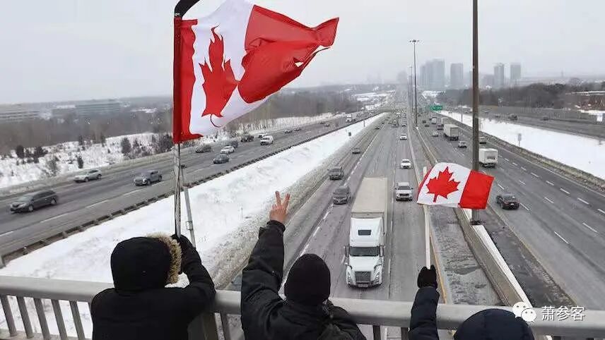 1月27日今天,当“2022年自由车队”经过多伦多401高速公路时,支持者站在立交桥上表示支持