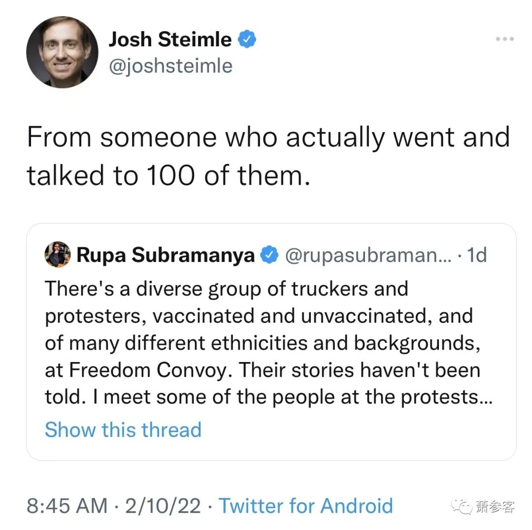 独立记者鲁帕·苏布拉曼亚(Rupa Subramanya)与100多名在加拿大渥太华抗议 COVID-19 强制疫苗规定的加拿大卡车司机交谈,以确定 “卡车司机想要什么”。她的报道与一些自由派媒体对该 自由车队 的恶意描述形成鲜明对比,并因此受到一些政治评论家的赞扬。