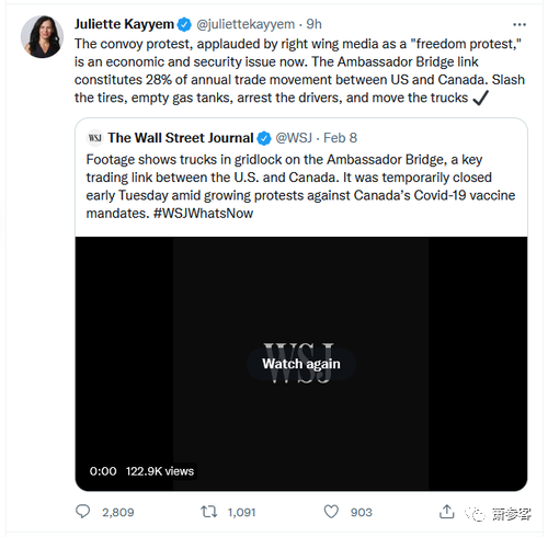 哈佛大学教授、CNN 分析师和前奥巴马行政副部长、国土安全部副部长朱丽叶特·凯耶姆(Juliette Kayyem) 呼吁对聚集在连接密歇根州底特律,和安大略省温莎市的 “大使桥“ 上的自由车队抗议者,实施暴力和破坏。
