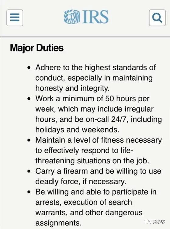 更惊爆眼球的是,一般被认为是和平执法的税务官员,现在居然被要求 “携带枪支,并愿意在必要时使用致命武力”,以及 “愿意并能够参与逮捕、执行搜查令和其他危险任务”。