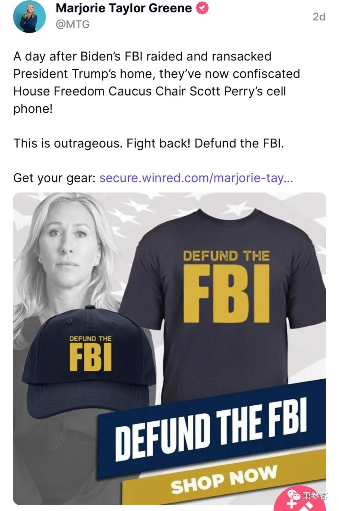 “取消FBI资金!”来自佐治亚州的共和党众议员玛乔丽·泰勒·格林(Marjorie Taylor Greene)在真相社交上发帖称。