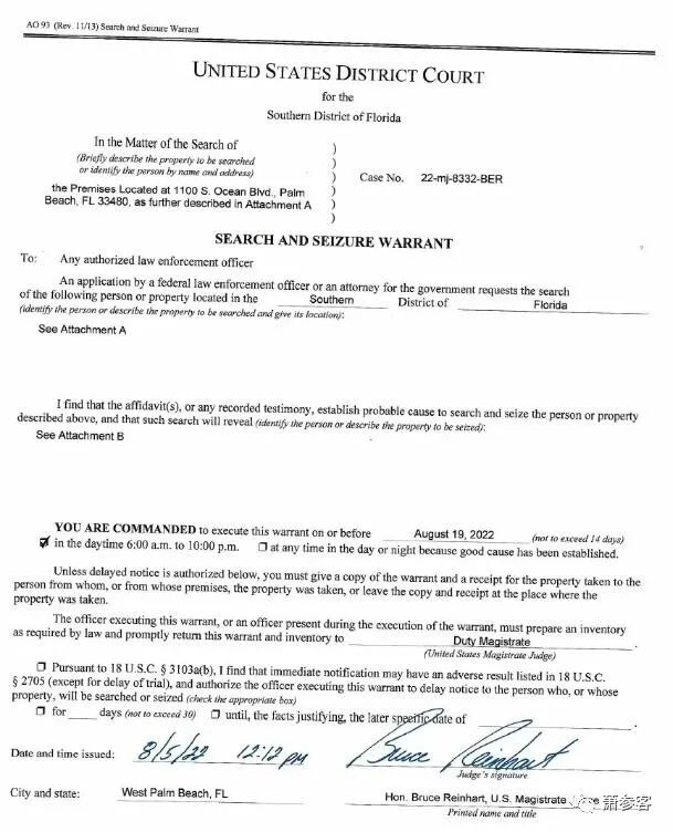 授权搜查川普总统在海湖庄园的搜查令显示,它是由美国地方联邦法官布鲁斯.莱因哈特(此人介绍详见:今天他们用FBI特工抄川普总统的家)于2022年8月5日下午12点12分签发的--在司法部和FBI执行搜查令而进行抄家之前整整三天。