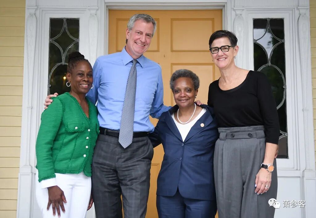 左夫妻是原纽约市长白思豪,右两位是莱特福特市长与高个子黑衣的妻子