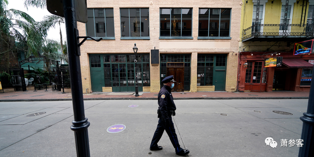 2021年2月16日星期二,新奥尔良法国区狂欢节期间,一名警察走在几乎无人的波旁街。新奥尔良官员希望在暴力犯罪增加的情况下加强日益减少的警察队伍,于2022年9月8日星期四宣布了一项为期三年的8000万美元的计划,为所有警察加薪,提供免费医疗服务,并为新雇员提供3万美元的奖金。