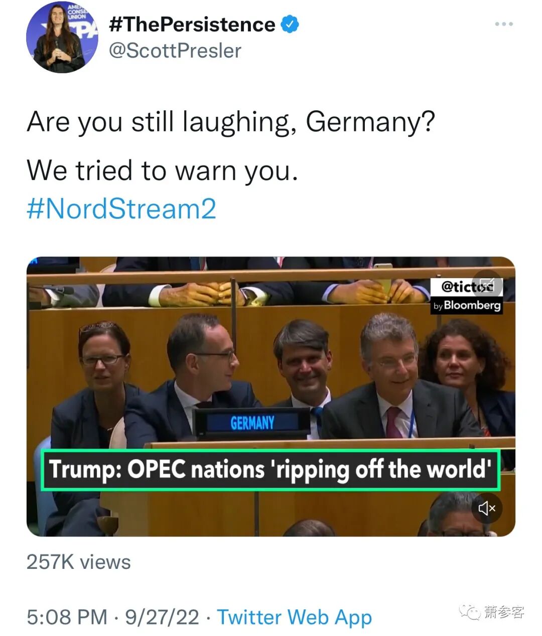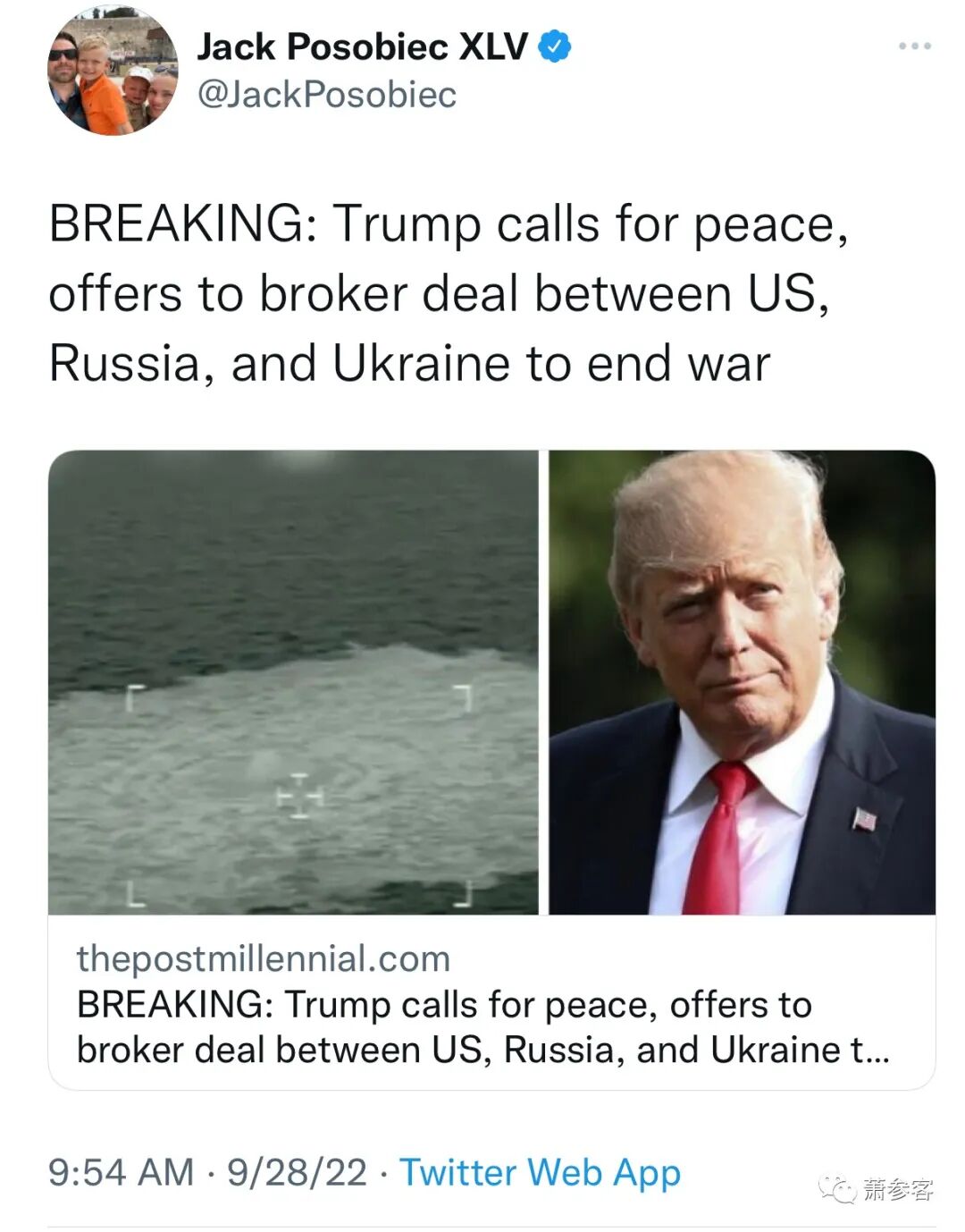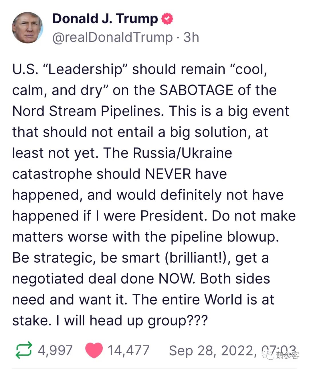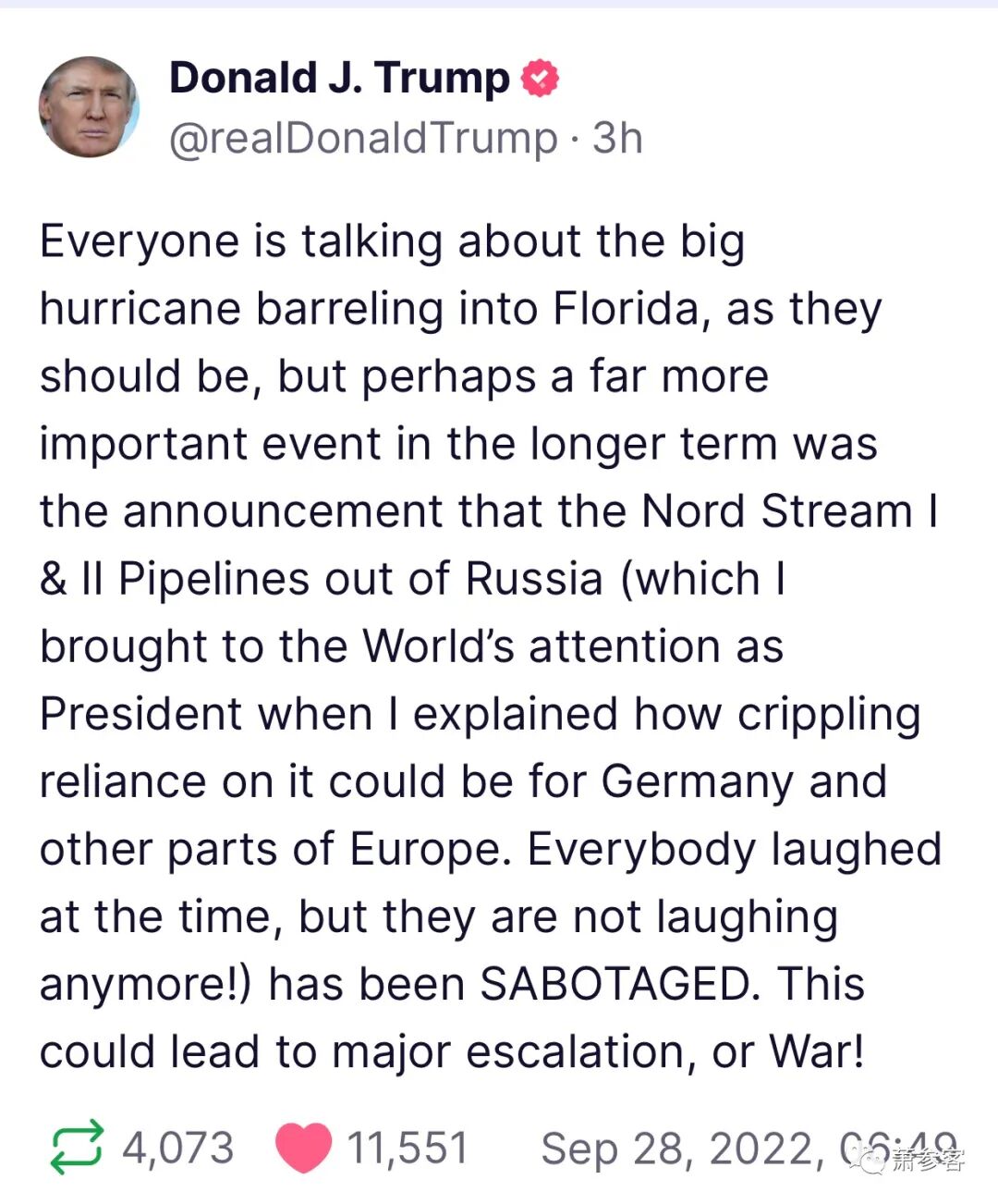 “每个人都在谈论飓风袭击佛罗里达,他们应该这样做,但从长远来看,也许更重要的事件是宣布从俄罗斯出来的北溪一号和二号管道(我当时作为总统提请世界注意,我解释了对北溪的依赖可能会对德国和欧洲其他地区造成的破坏。当时每个人都在笑,但他们现在不再笑了!)已经被破坏了。这可能导致重大的升级,或者战争。”(早上6:49am)