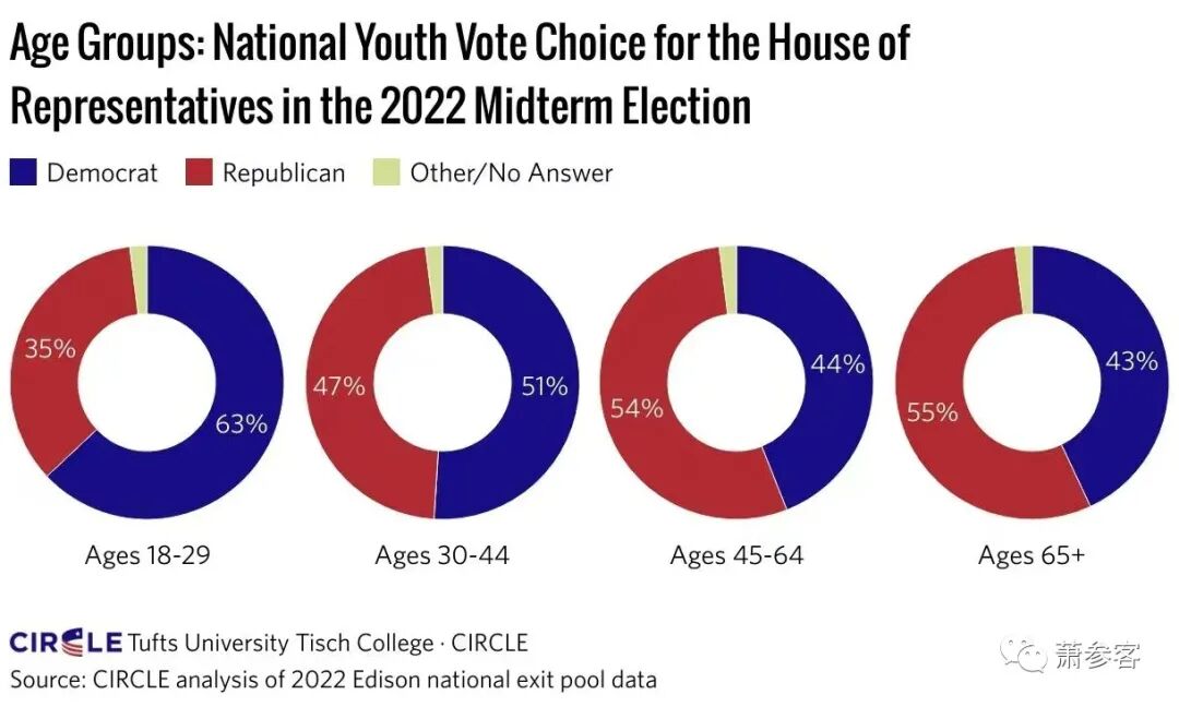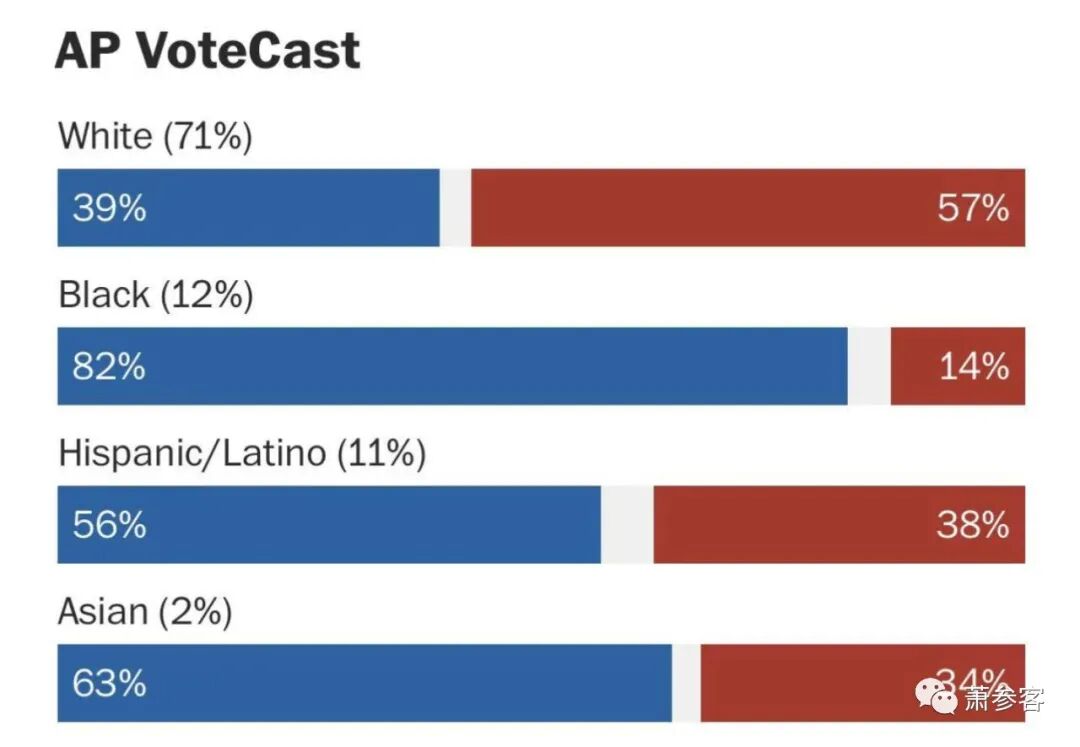 2022中期选举投票人族裔的统计:白人:39%投民主党(蓝色);黑人:82%投民主党;西班牙/拉丁美:56%投民主党;亚裔:63%投民主党