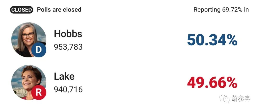 亚利桑那开票率69.72%,胜选呼声最高的卡丽·雷克(Kari Lake:卡丽湖)仅落后民主党对手凯蒂·霍布斯(Katie Hobbs)13,067票。在还没有完成计票的2个选区,是霍布斯领先。
