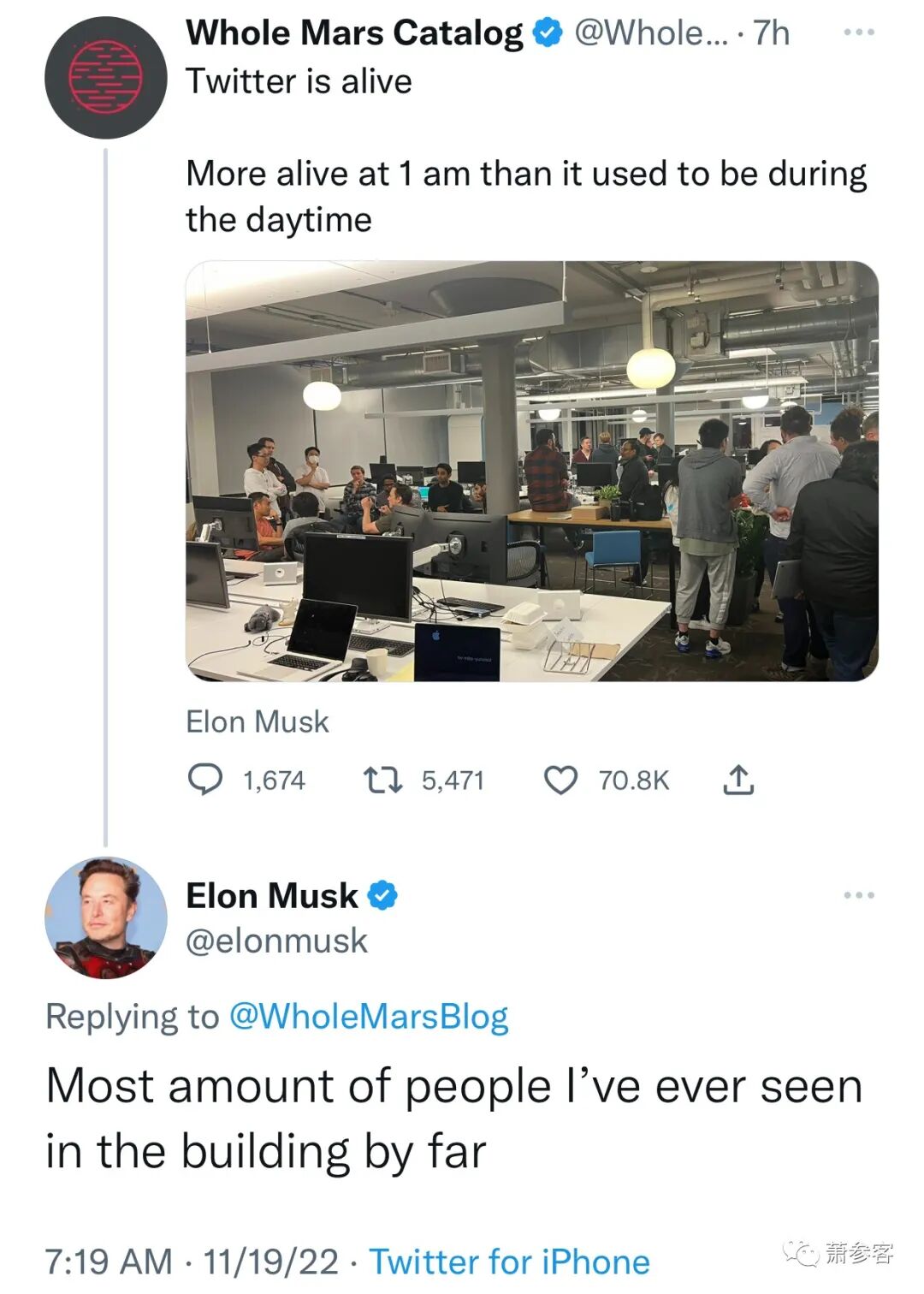 凌晨4点半,马斯克的推帖:刚刚离开推特总部的代码审查清早,马斯克的推帖:到目前为止,我在这栋楼里见过的人数最多。对比一下,马斯克接管推特前后的照片,左图为左疯管理下的推特的高薪员工们的合影,完全符合政治正确的人物搭配,男靠不住,有人说,这么多女人每天能写几句Code(编程);也有人说,熬咖啡的人太多。右图为打攻坚战的计算机工程师与马斯克的合影。