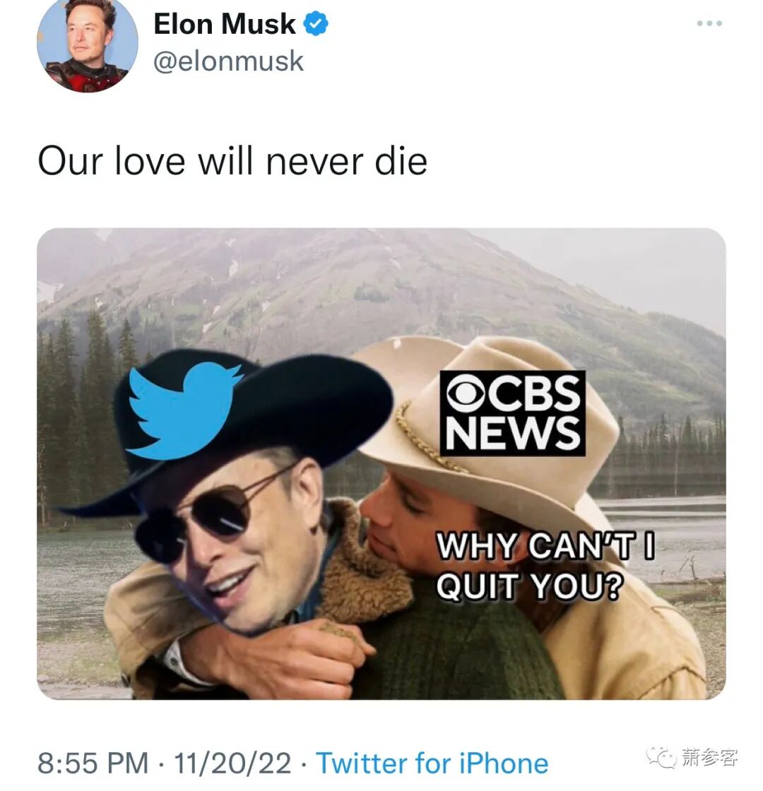 保守派大V Caturd的推帖:不管是爱他还是恨他,但自从马斯克接手后,推特变得更好、更有趣了一百万倍。首先,左疯的主流媒体的战斗机CBS,不爽马斯克的民调结果,恢复川普总统的推特账号,决定公开宣布离开推特!