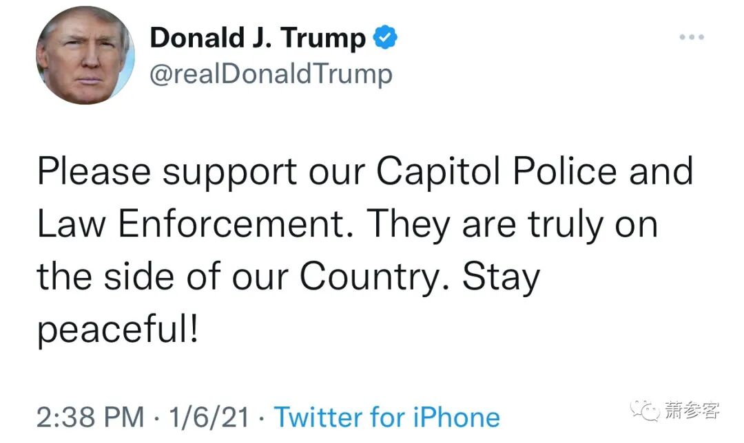 川普的推帖:我要求在美国国会大厦的所有人保持和平。不要使用暴力!请记住,我们是法律和秩序的党派 - 尊重法律和我们伟大的蓝衣(警察)男女。谢谢你!川普的推帖:请支持我们的国会大厦警察和执法部门。他们是真正站在我们国家一边的。保持和平!
