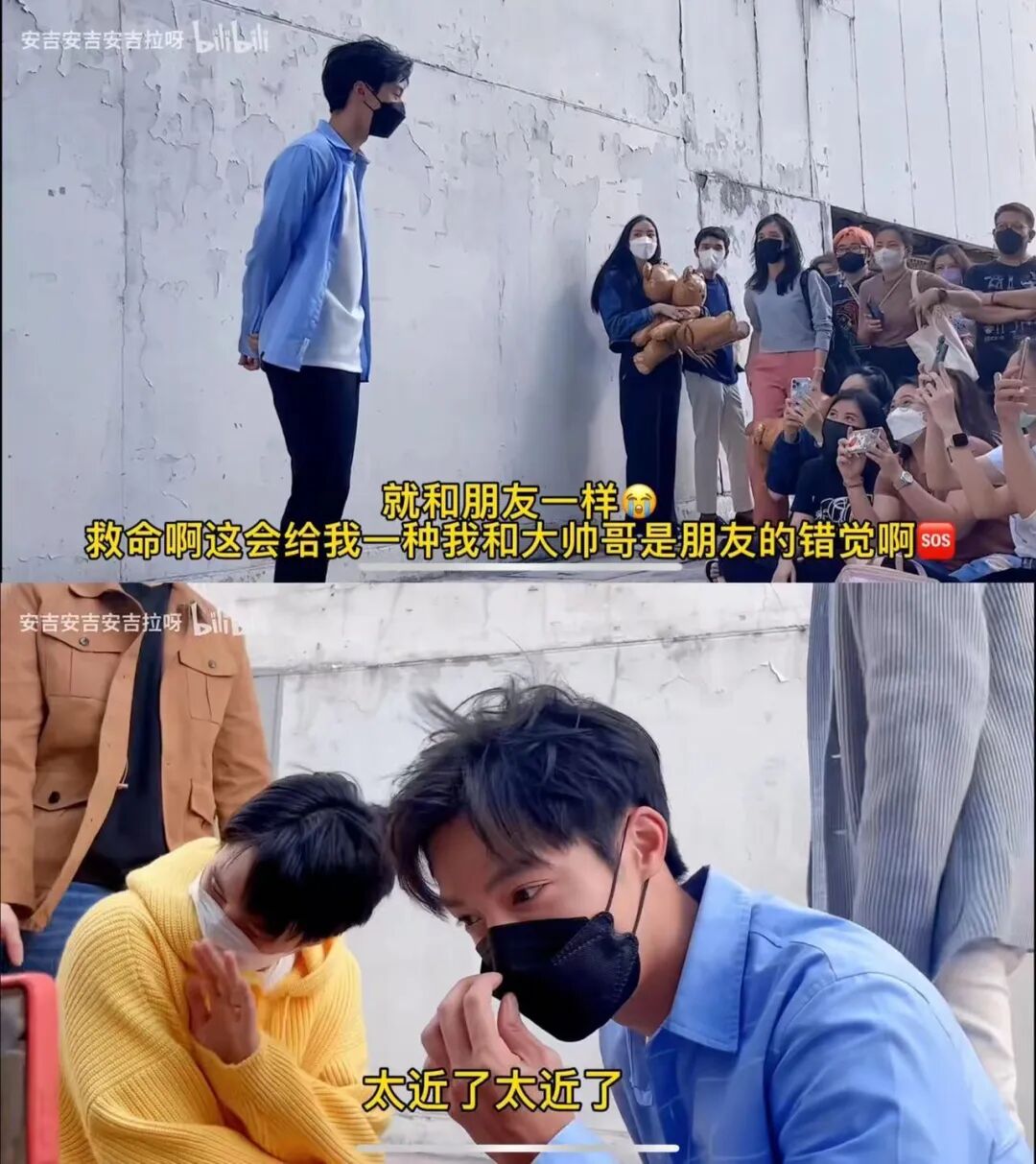 安吉拉把这次经历的视频上传到了B站,引得评论区一片羡慕。她回复网友:“两次的开销就花了20的车费,却得到了Job递来的水(“点名”途中演员们给到场粉丝送水)、棒棒糖还有签名照。”这是在内娱能实现的吗?几乎不可能。对于泰国追星成本低,林同学阐述了自己的看法。在泰国(或者说曼谷)偶遇明星并非难事,很多明星也会在社交媒体上大大方方地晒自己的生活。其实挺容易在高端商场、高人气餐厅等地方遇到明星,很多明星还会跟认出自己的粉丝大方互动,所以粉丝们对见偶像不会有太大的执念。形容起自己的追星感受,雯雯说:“在泰娱追星,就像是你在追,他就在那里等着你。”在商场偶遇了正在拍摄的泰国明星们。/受访者提供。