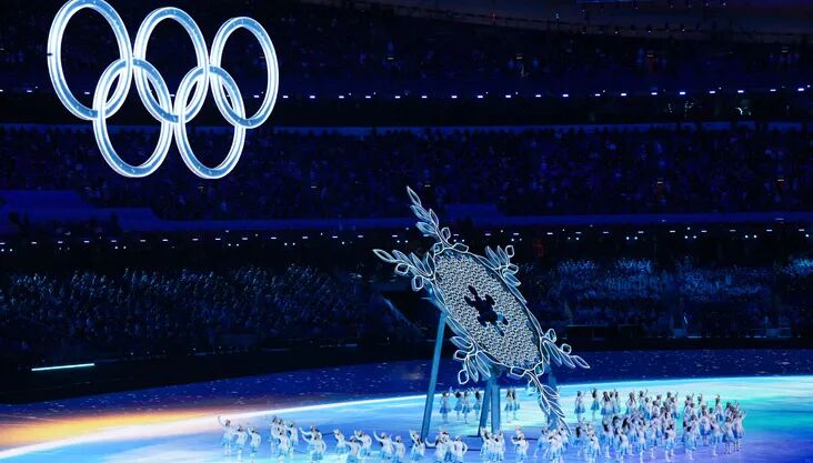 在升国旗奏国歌后,场地上升起了设计精致的「冰雪五环」,展示整个冬奥会的历史。