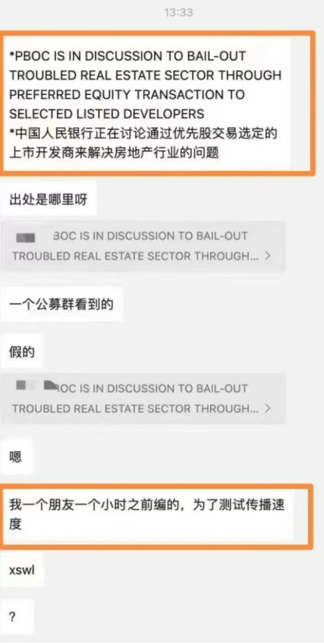 这则关于房地产的假消息以“中英双语”的形式出现,又是从公募群里流出,看起来确实“蛮专业的”。股民湘琴告诉蓝鲸记者,她就是一个经常遭遇“小作文”的人,一般是在100人以上的群聊,群友大多都有一些专业背景。每每有类似消息爆出时,总能引起讨论和争议。