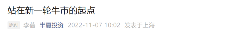 据中国证券报报道,11月以来,私募行业颇具影响力的基金经理不约而同发声,表达对A股的乐观预期。今日,半夏投资创始人李蓓发文称,A股很可能已经走过了本轮下跌的最低点,站在新一轮长期牛市的起点。宁泉资产创始人杨东也在近日表示,市场又到了一个把握好周期的关键时点。