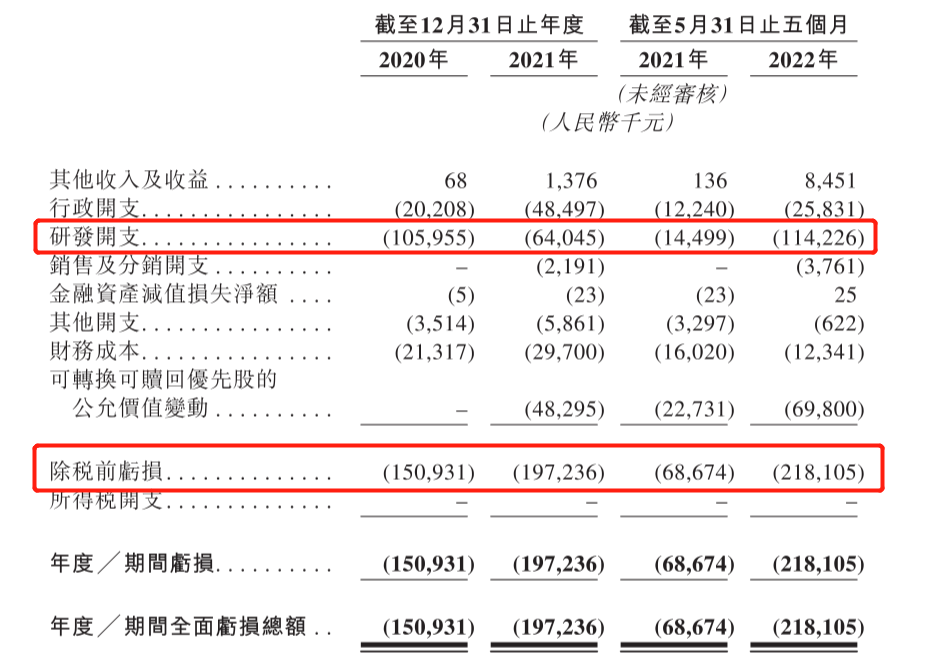 据其招股书透露,公司仍处于持续投入期,目前尚无经营收入,2020年、2021年、2022年前5个月其他收入及收益分别为6.8万元、137.6万元和845.1万元。2020年以来合计亏损5.6亿元,其中研发支出是主要的亏损来源。2020年、2021年及截至2022年5月底,真实生物的研发开支分别约为1.060亿元、6404.5万元及1.142亿元。