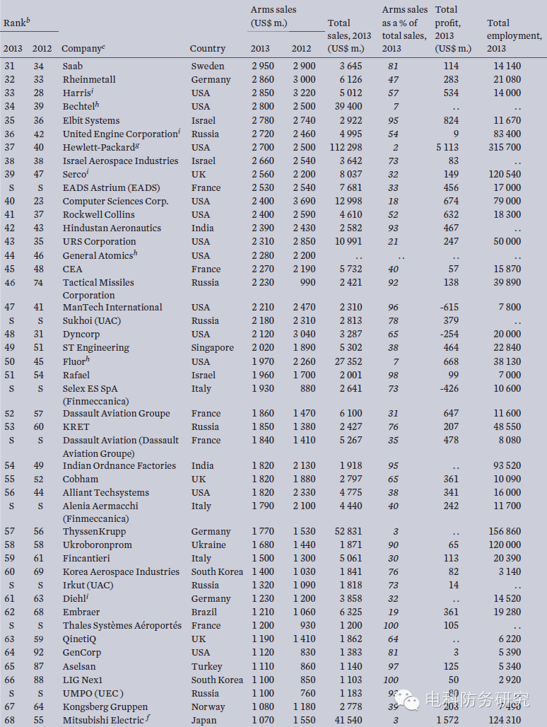 巴西航空工业公司是首次跻身百强之列。其利润增幅经两年达到36%,使它从2011年的第83位上升到第66位。百强中的韩国国防工业企业的销售总规模增长了4.2%,与2002年相比其所出售的军品规模翻了一番。