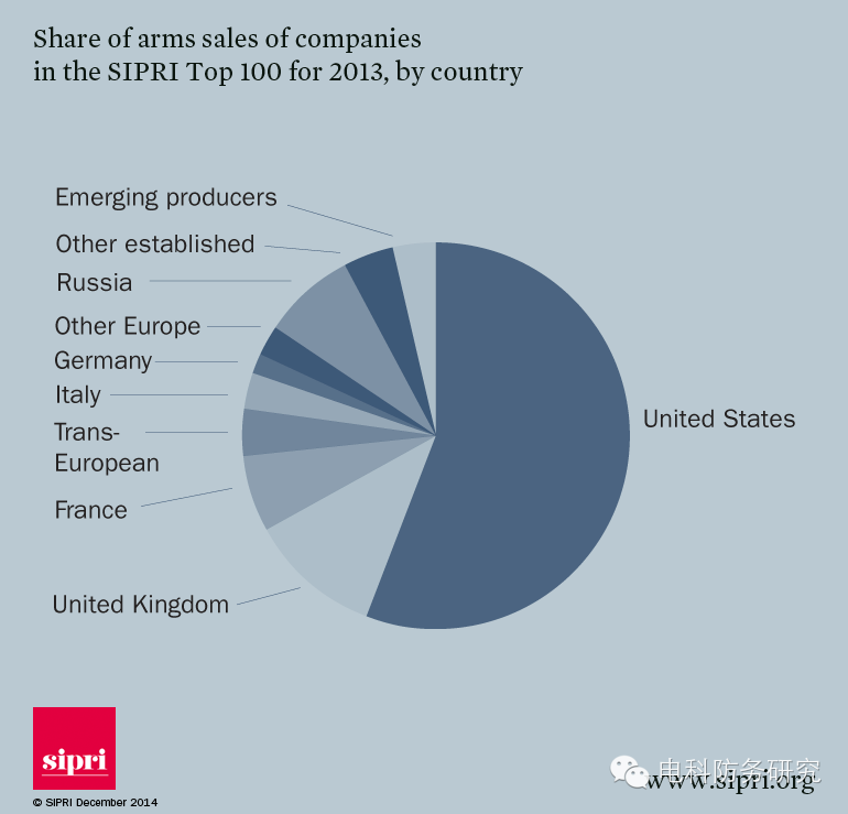 北美和西欧以外的国家的公司所占份额从2005年起增加了13.5%,目前达到峰值。但由于数据不足,斯德哥尔摩国际和平研究所所统计的军火制造商的前一百强名单不包括中国的公司。