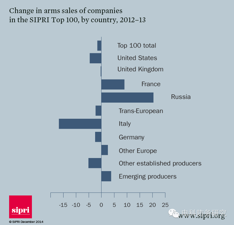 SIPRI武器与军事开支项目主管Aude Fleurant博士表示,“北美和西欧以外的公司在全球军火销售中所占的份额从2005年开始就一直在上升。2013年,这些公司在SIPRI100强的总销售额中占了15.5%,达到了SIPRI100强诞生以来的历史新高。”