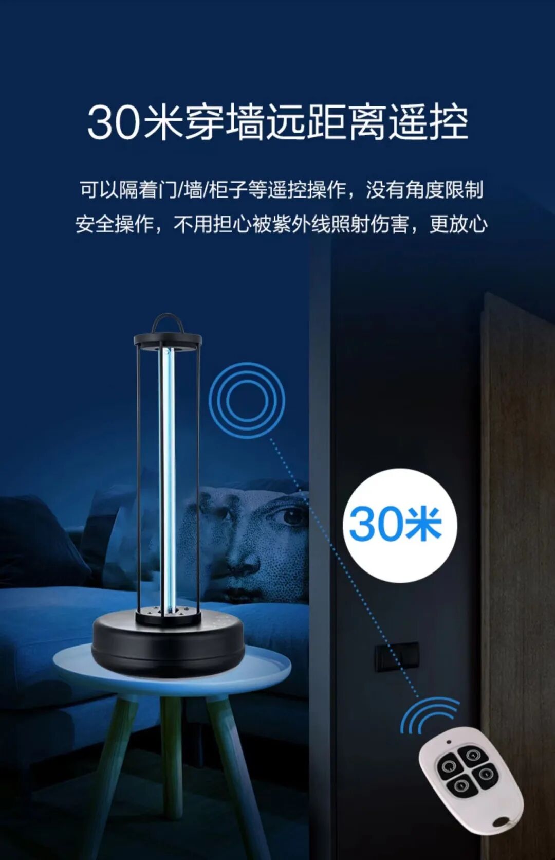 人体是不能长时间暴露在紫外线之下的,大峥的这款消毒灯搭配上了30m远距离遥控,隔着墙、门、柜子等都可以开启,不用担心紫外线辐射的危害。还可以按下按键后倒计时10秒启动,给你足够的安全空间。团购时间 12月27日(周二)-12月29日(周四)