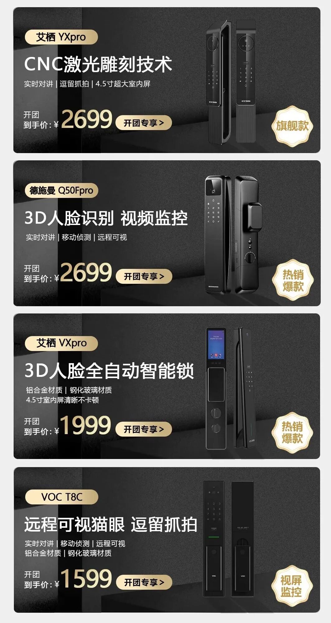 出门又又又忘带钥匙了,无奈只能狼狈“翻窗回家”。这次非得换个指纹锁不可,有手就能开,高端款还能刷脸,科技使我快乐!🔺想要拥有室内猫眼大屏的,看这个——HX-Pro/VX-pro。基本只在专柜销售的高端品牌,质量和开锁技术属于top顶尖级别。上期好评和销量的NO.1,1k+的全能配置版啥功能都有~人脸指纹识别秒开锁,手感、灵敏度一点都不输四五千块的智能锁。室内配应急大旋钮,有急事一拧就开~🔺凯迪仕k20系列也是时下流行的智能猫眼款,可视对讲、逗留抓拍功能一个不少。全自动电子锁体可以对“门未关、门上锁、锁体异常”等状态进行感知,同步发送警报,长期离家还可以设置一键离家布防模式。手里拎着快递、购物袋也不怕,识别指纹自动开门,进屋脚踢关门一气呵成,没有阻碍!给爸妈家和自己家全都换一遍也不心疼,如果只需要一款简单的把手锁,选这个再合适不过。指纹、密码、磁卡、机械钥匙多种开锁方式,适合不同家庭成员使用,不怕娃丢钥匙,爸妈也不会碎碎念“净整些洋玩意”~🔺人脸识别的T8 FACE当然是更好的选择,家有老人、孩子的可以选择。团购时间 12月26日(周一)-12月28日(周三)