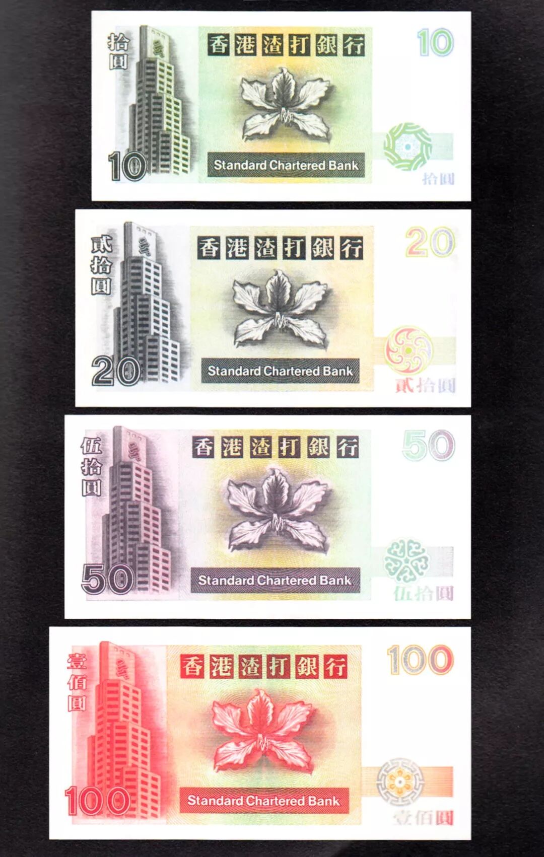 在2010年,渣打银行更新了他们的钞票设计,这次的设计就更能体现跨文化的对比了。纸币的正面依然保留了吉祥瑞兽的使用,而背面则使用了代表传统历史文化的图案和代表现代新科技的图案。20元的纸币中使用的是中国计算工具算盘和电子计算机中的二进制代码;50元的是一把中国古锁和现代银行金库门;100元出现的是宋代篆刻印章和电子线路板;500块的则是民间面相图和反映现代生物面部识别技术的图像;最高面额的1000元则是唐代铜钱和智能芯片。这样一新一旧的图案一前一后的出现,每一组都体现出了科技与文化遗产的主题。