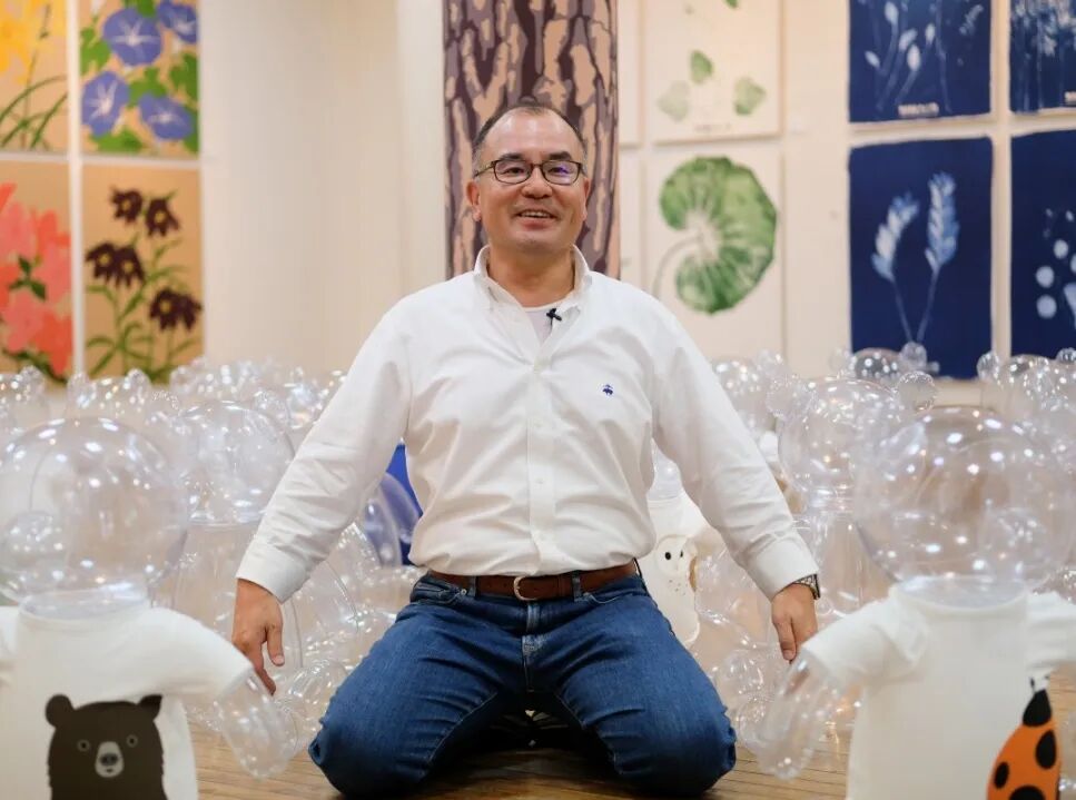 新村则人在自己的展览上COSPLAY道具熊