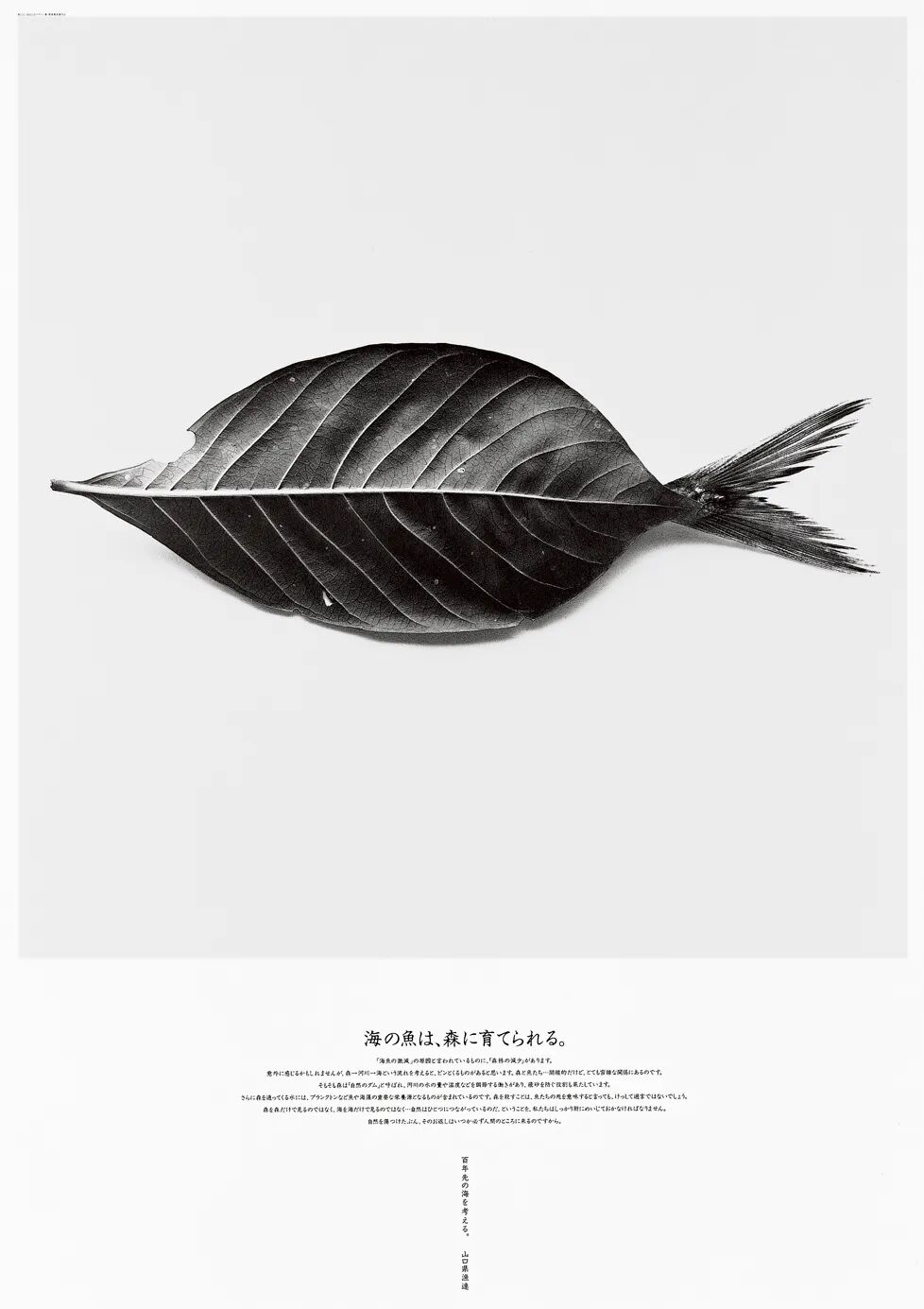 上面的海报是这一系列中最知名的一张。有一次新村则人从电视节目中了解到,森林采伐是海鱼减少的一个重要原因,于是他专门收集了一些树叶,把叶子放在一个空旷的背景上,末端伸出一个鱼的尾巴,乍看去两者便形成了一尾鱼的形状,形象地表现出森林与鱼类唇亡齿寒的关系。