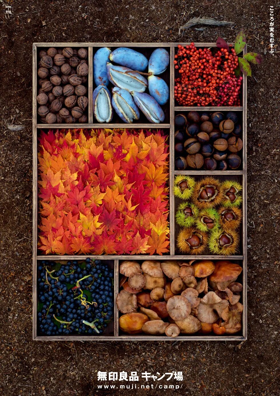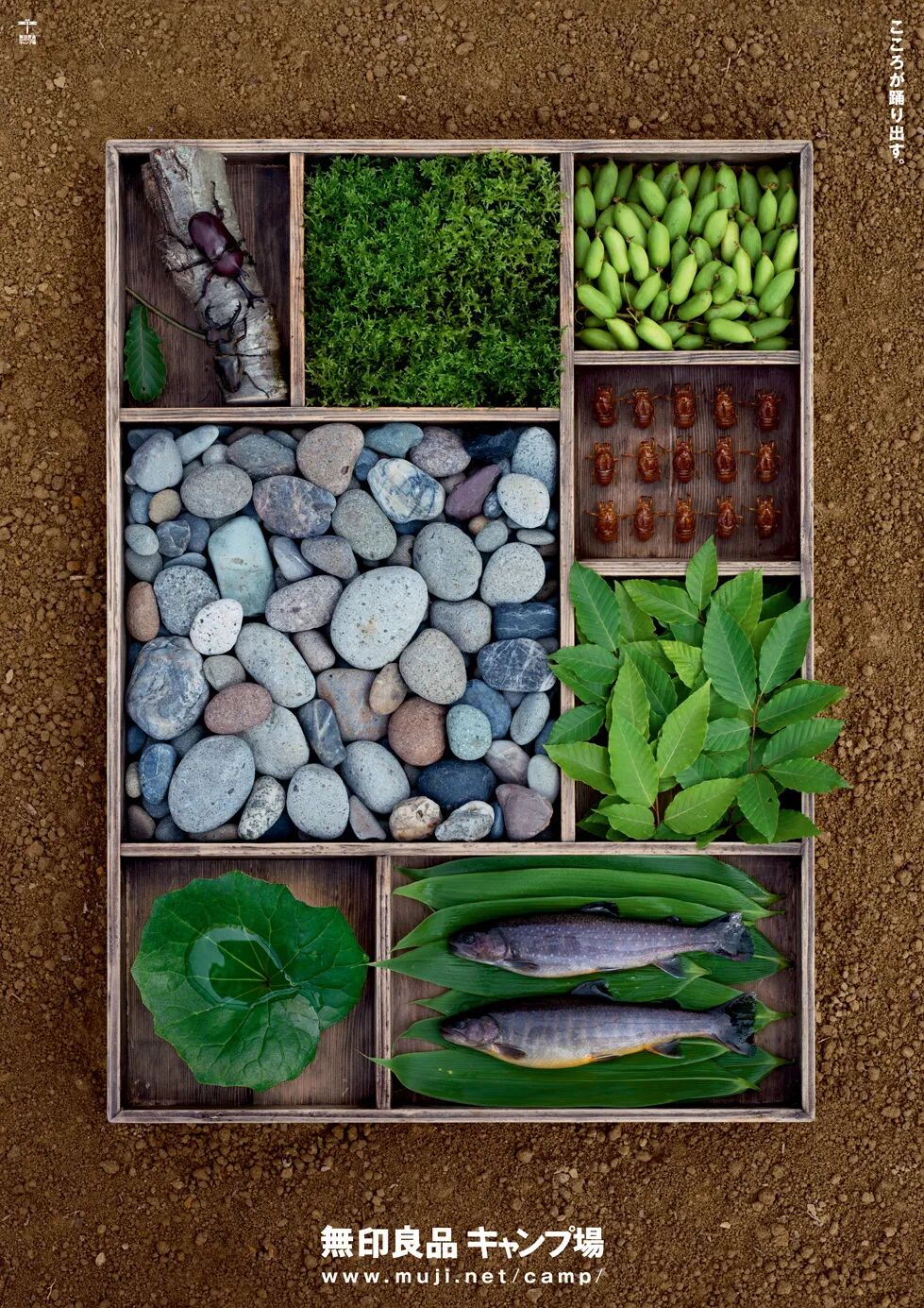 这组海报(2014)的概念是用一个盒子装满露营地一年四季的时令产品,像一个大饭盒一样。你觉得这个项目的重点是什么?新村则人认为“盒子”是本次项目的重中之重,因为这个盒子它必须是什么呢?手——工——的。于是他找到了“箱作家”宇井孝先生来为他量身打造这个盒子。
