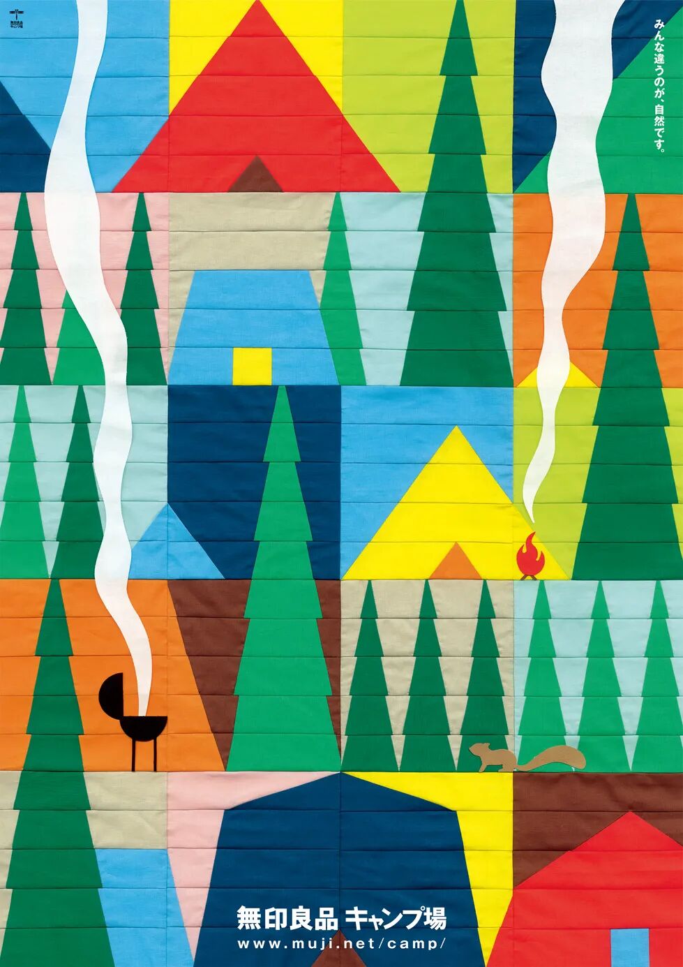 这组海报(2016)是通过三幅插画来展示露营地的各种场景,你放大仔细看,里面有很多美好的小细节,看得我都想就地露营。这三组插画由庭野広祐创作完成之后本来就可以了,但新村觉得还是缺少一些质感。这里我知道缺少什么质感,就是缺“手工感”,他的套路我已经摸透了。新村打算将这组插画做成露营被,于是他通过出版社找到了一本叫做《摩登被子风格》的作者藤田久美子和中岛一惠,请求她们来为他制作。写到这我觉得,在日本你干啥干得好就能成个“师”,我估计我姥姥要是生在日本,现在也能是个什么匠人。最终他们花了一个月时间缝出了这三床被,你可以再看看细节,缝得确实好。