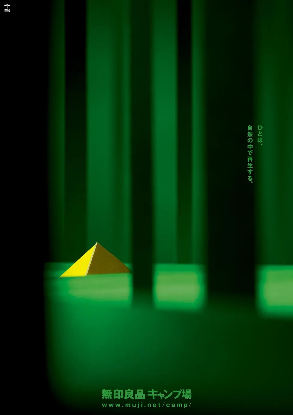 这组海报(2019)的主题是“人在自然中再生”,新村则人回收了一些被扔掉的纸箱,利用它们制作了帐篷和山,以此来表达循环利用的概念。