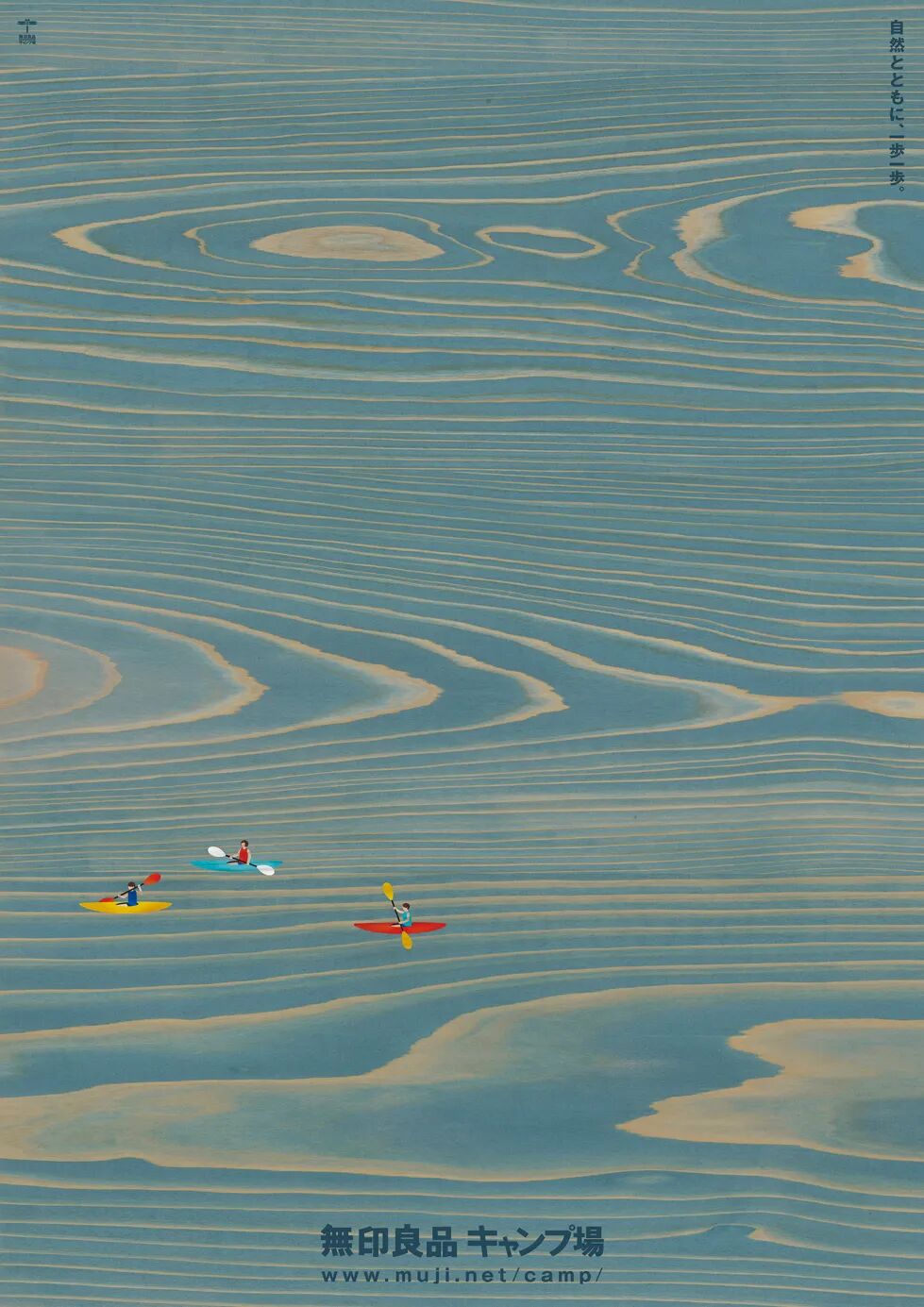 这组海报(2015)是想用木板的天然纹理来表现露营地的草原和湖泊。木板需要仔细挑选就不用多说了,染色更是颇费了一番功夫。依然有人建议新村用电脑给木板着色,但是他嫌效果太粗糙,决定自己动手染。尝试了几种方案均以失败告终,不是不够均匀就是不够透。灰心丧气之余他开始刷脸书,一不小心就勾搭上了“板染”技师清水将勇,当即决定杀去茨城县面基。最终,如愿以偿染出了满意的效果。建议放大观看。