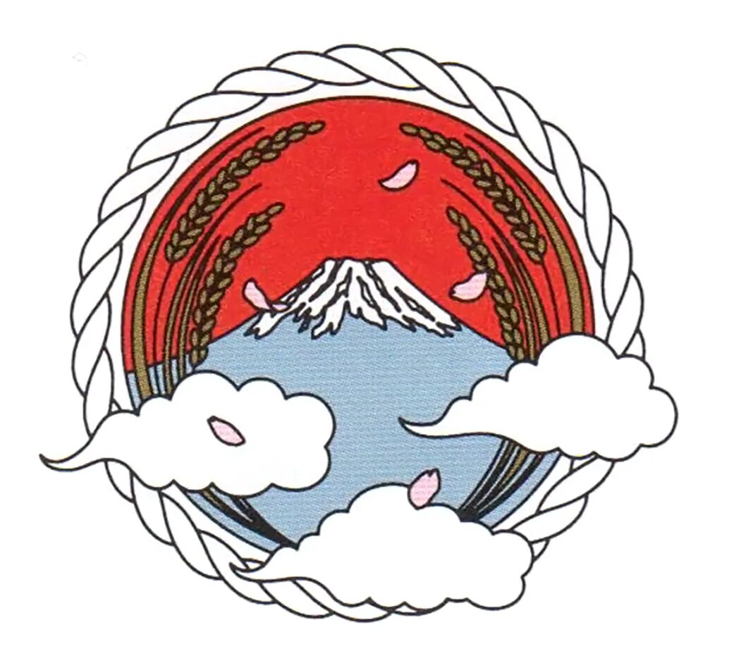 标志上有稻米的栽培不可缺少的云雨,而樱花凋零表现的是插秧时期,还有富士山的冠雪、太阳、稻穗等,在一个画面中就表现了春夏秋冬。