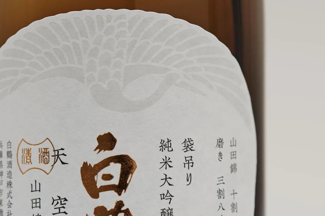 在酒标的制作工艺上面,白鹤采用了类似水印的效果,仔细看上面布满了细密的网纹,这是一种复杂的日本传统制纸技术。还记得之前介绍过的“越乃寒梅”纪念款么?这种在酒标上面大动干戈的做法,除了体现酒的高端定位之外,同时兼具防伪功能。