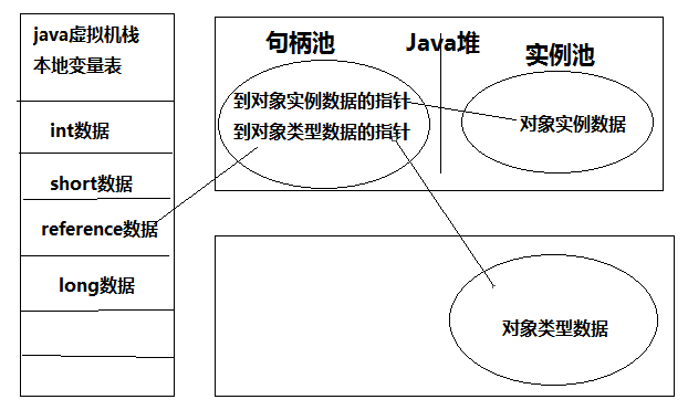 句柄访问的方式就是虚拟机栈中存放着reference数据,reference数据当中存放着指向对象的实例数据指针和指向对象的类型数据的指针,这些指针指向相应的对象实例数据和对象类型数据。