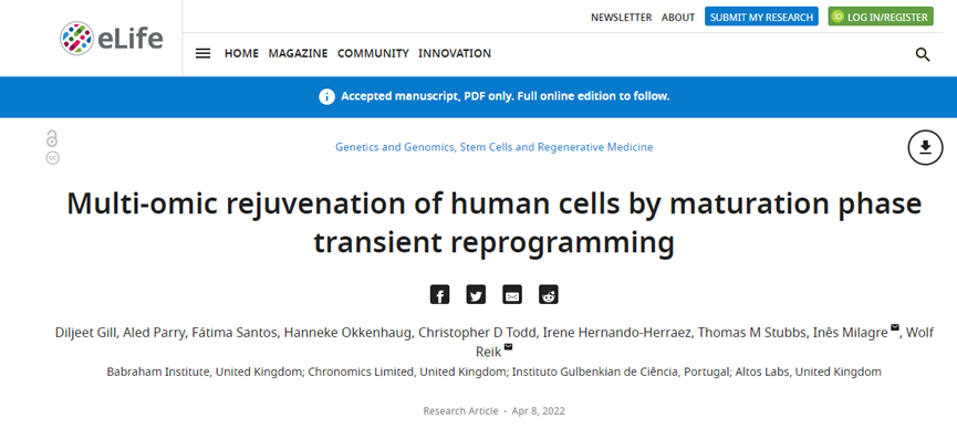 [1]Gill D, Parry A, Santos F, et al. Multi-omic rejuvenation of human cells by maturation phase transient reprogramming. Elife. 2022 Apr 8;11:e71624. doi:10.7554/eLife.71624. Epub ahead of print. PMID: 35390271.