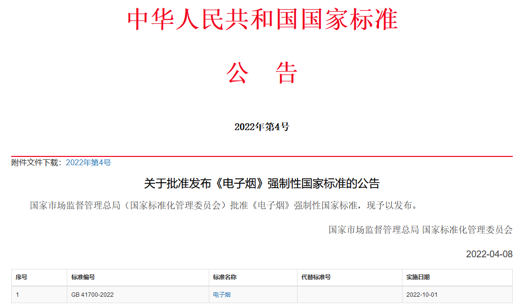 4月12日,国家市场监督管理总局、国家标准化管理委员会批准《电子烟》强制性国家标准发布,自2022年10月1日起正式实施。《电子烟》强制性国家标准的发布,意味着中国电子烟长时间以来无国家标准生产阶段的结束,对行业具有重要意义。