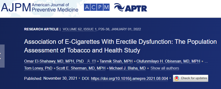 [3]El-Shahawy O, Shah T, Obisesan OH, et al. Association of E-Cigarettes With Erectile Dysfunction: The Population Assessment of Tobacco and Health Study. Am J Prev Med. 2022 Jan;62(1):26-38. doi: 10.1016/j.amepre.2021.08.004. Epub 2021 Nov 30. PMID: 34922653.