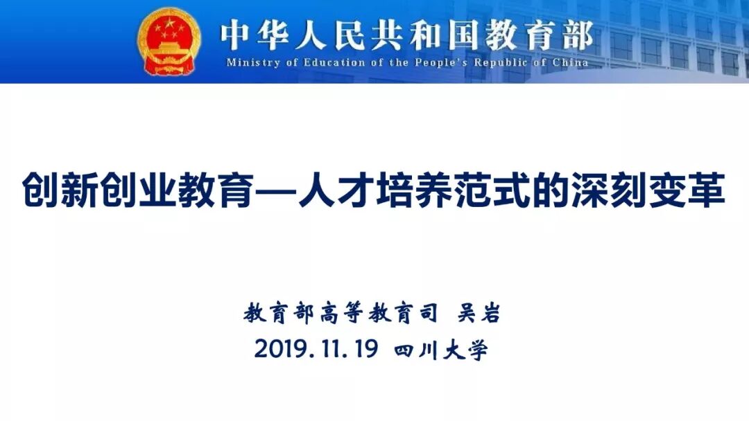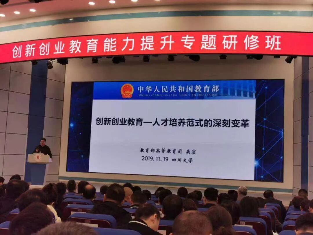 2019年11月19日,创新创业教育能力提升专题研修班在四川大学举行。教育部高等教育司司长吴岩在开班典礼上作题为“创新创业教育——人才培养范式的深刻变革”的演讲。