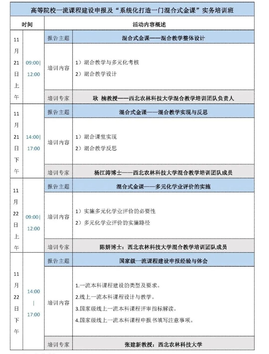 西北农林科技大学混合教学种子团队组建于2016年,其中高级职称3名,团队成员长期从事混合教学的实践探索和培训,具有丰富的混合教学方面的授课经验。为了帮助教师熟练掌握数字化教育技术,顺应教育信息化的浪潮,团队从教学方式的混合、学习方式的混合、交互方式的混合、教学工具的混合、教学资源的混合和教学评价的混合等混合教学模式的6个要素出发,设计完成相关培训专题。自成立以来,该团队曾赴重庆大学、海南大学、大连大学、江苏大学、陕西中医药大学、西安建筑科技大学等10余所高校开展混合教学培训及交流,累计培训近50场,得到了广泛好评。为进一步帮助高校教师在“金课”建设上有的放矢,助力高校教师拥有打造金课的能力。我单位决定联合西北农林科技大学混合教学团队举办《高等院校一流课程建设申报及“系统化打造一门混合式金课”实务培训班》(线上)现将具体内容通知如下: