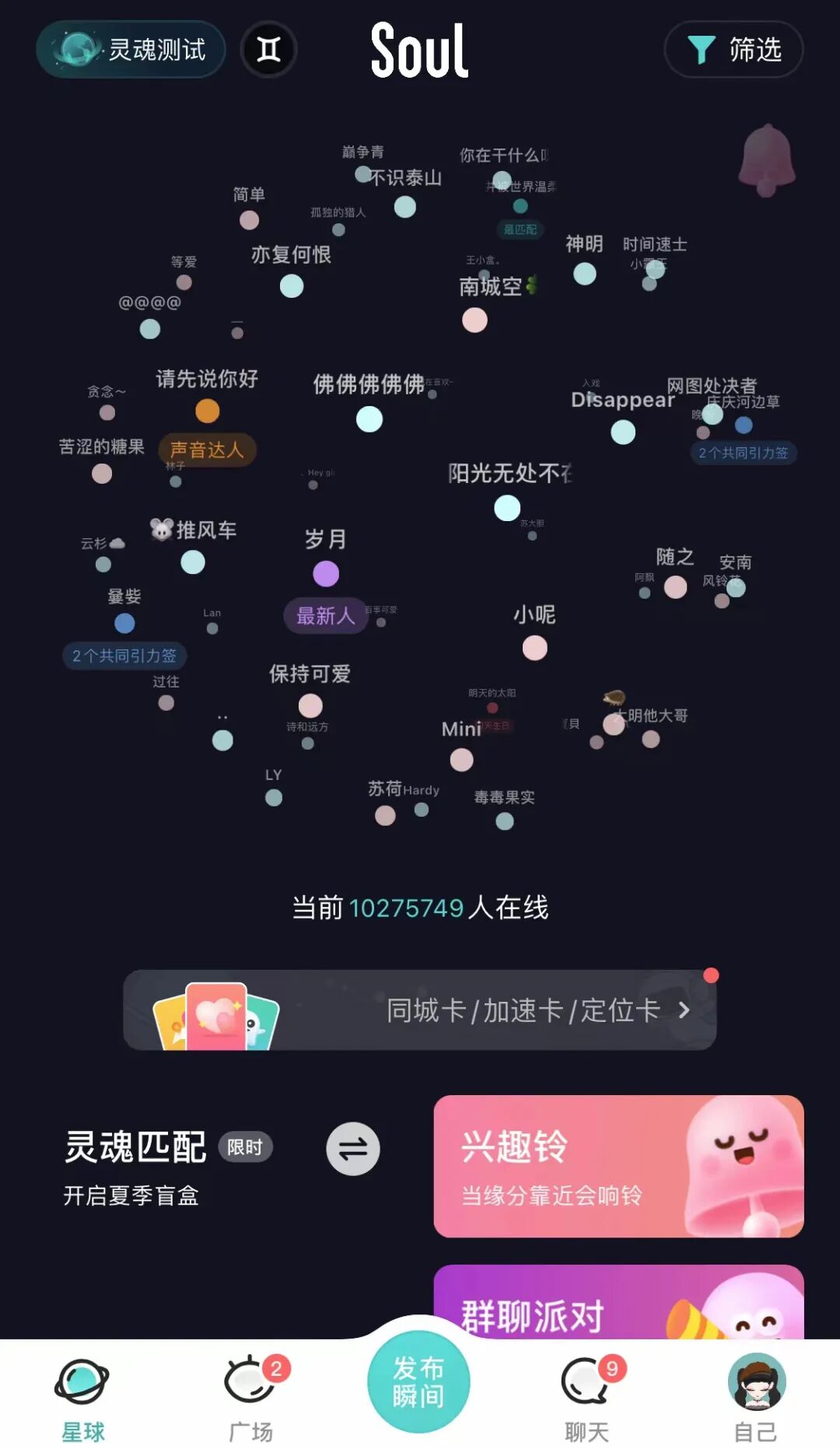 每个注册Soul的新用户都需要经过一系列灵魂测试,按照测试结果入驻不同的“星球”,如“艺术家”“思想家”“务实家”等。用户随即可以通过“灵魂匹配”等方式寻找聊天对象;还能参加各种群聊派对,基于共同的兴趣和观点在平台上畅所欲言。