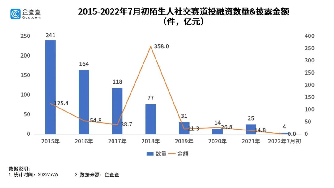 尽管陌生人社交存在这些伪命题,但也一度成为一级市场的投资风口。企查查数据显示,2015年至2022年7月,陌生人社交赛道共计发生投融资674起,披露总金额约640亿元。腾讯、IDG资本、经纬中国等机构纷纷入局。