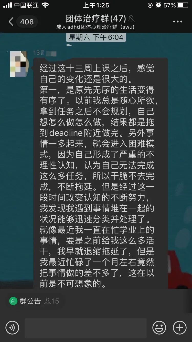 截图太多,我就不一一上传了,成年ADHD团体心理治疗课的课程反馈大家请点击这个链接(恭喜!为期三个月的成人ADHD团体心理治疗结束啦!)