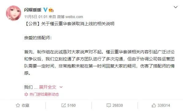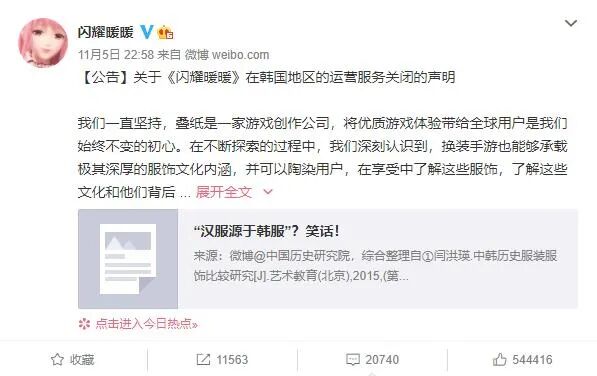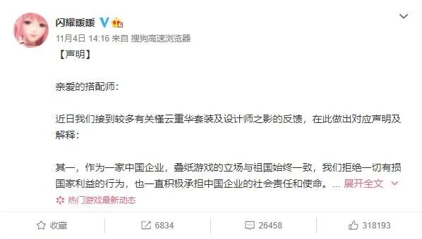 这让《闪耀暖暖》陷入舆论风波,迫于压力,《闪耀暖暖》的官方微博发声明称,“游戏架空世界,与现实无关”。