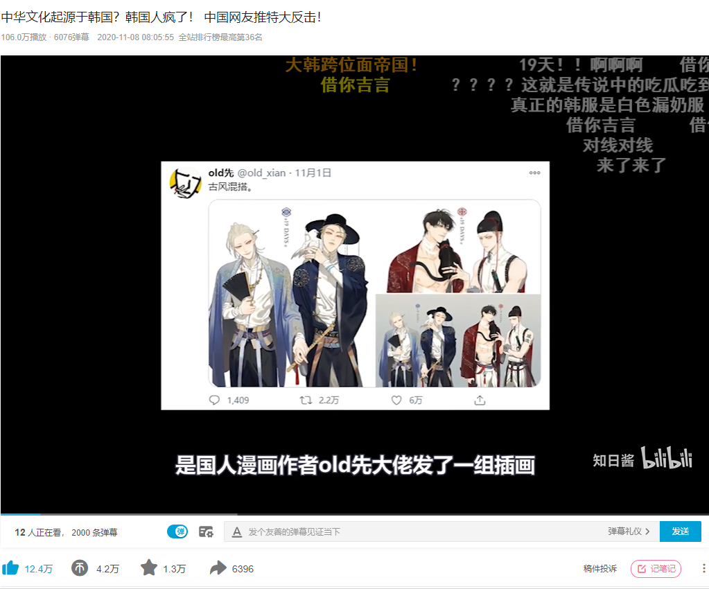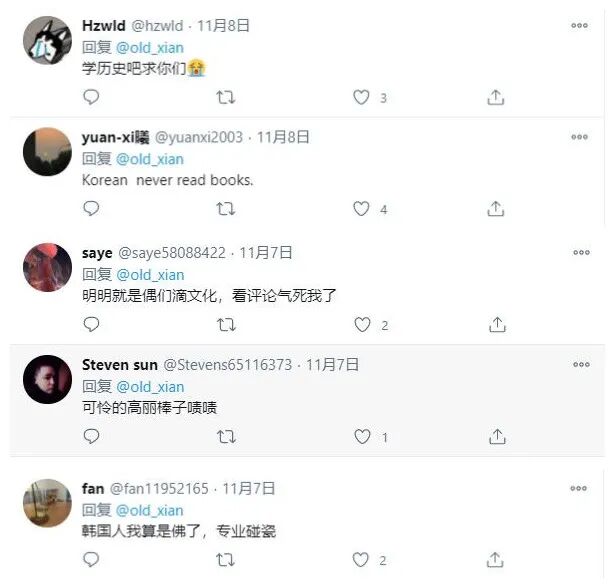 11月1日,博主old先和往常一样在twitter上发了一组古风漫画,文案很直接,就是“一组古风插画”。结果评论里炸了锅,一堆韩国网友跳脚,“不要再抄袭韩国的文化了!”“中国人要爱自己的文化”(配图)。