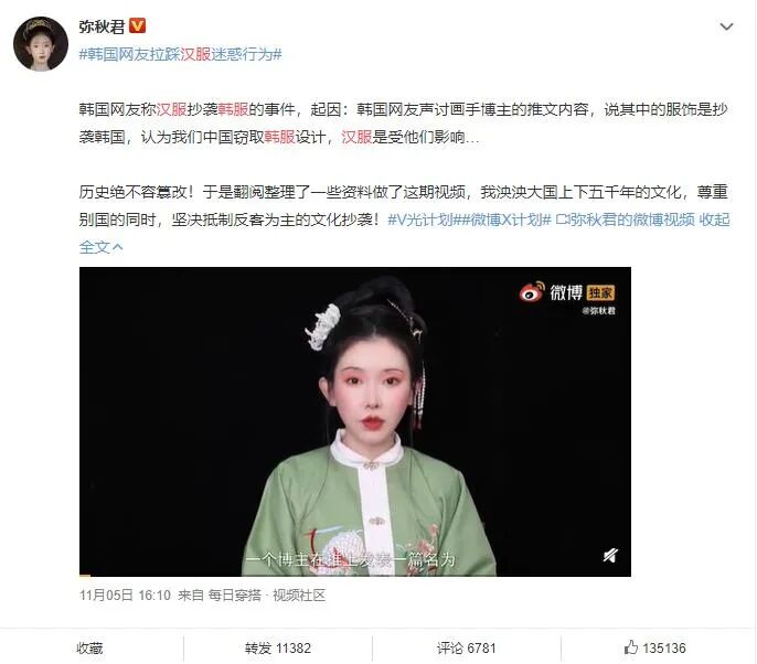 另外一边的韩国服务器也不消停,抓住这些元素作为证据,自信满满的称“汉服就是剽窃韩服”“汉服是源于韩服”。现在的网友可不是只能在在国内干着急了,直接翻墙理论起来!事情闹大后,国内的中国历史研究院、共青团等等官方主流媒体纷纷亲自科普,汉服源于韩服?笑话!