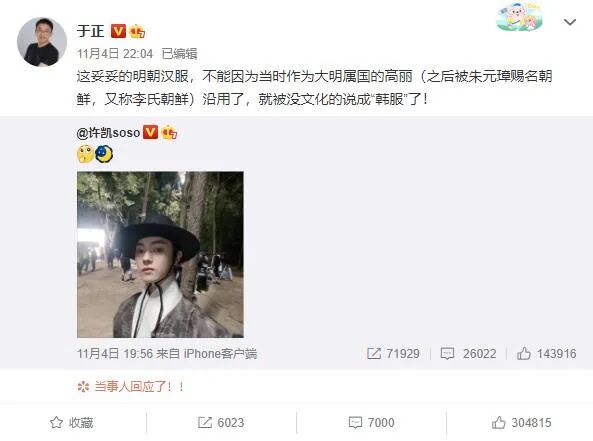 同样是11月初,明星许凯在微博上发了一张新剧的自拍照,很明显,是一套明制汉服,但是下面的评论就让人摸不着头脑了,“什么时候变韩国人了”、“这是在拍韩剧吗”……随后于正转发了这条微博,回应称,这是明制汉服,咱不能因为大明的附属国高丽用了,就说成韩服!随后于正直接在自己的ins上表示,没说错啊,韩国就是明朝的属国啊,服饰也是沿用明朝的啊,证据放上自己看吧!
