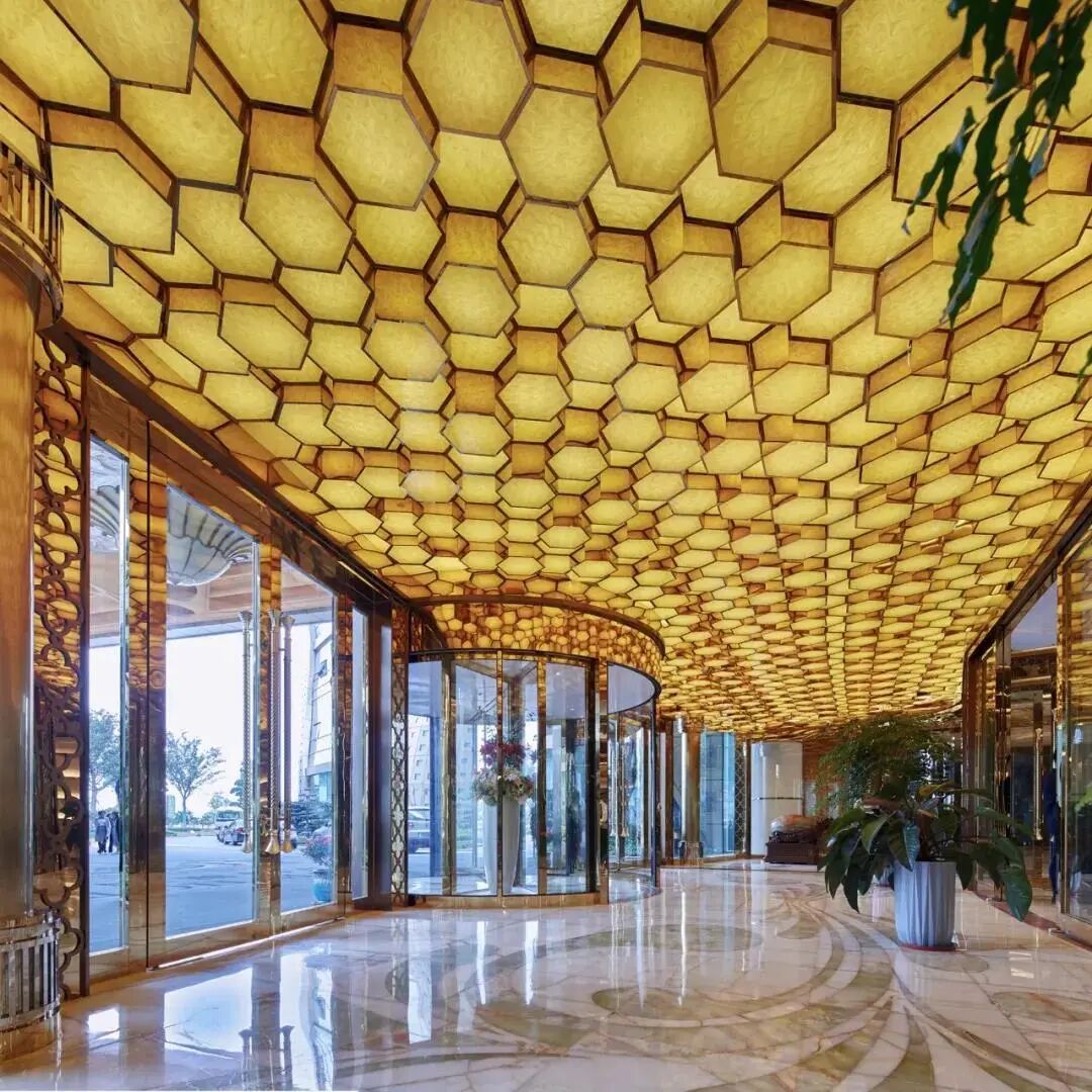 四根白玉兰花柱坐镇大堂,仿佛走进哪个科幻场景,金棕的配色,彷佛外星人也有着土豪的审美。