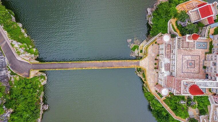 度假村就坐落在万峰湖景区,景区内的自然风光绝对是度假胜地,但在这个湖心岛上做这么一个城堡,就像是一种破坏,而且最重要的,是它不可逆。即使有朝一日把它拆掉了,也恢复不了原生态的地貌。
