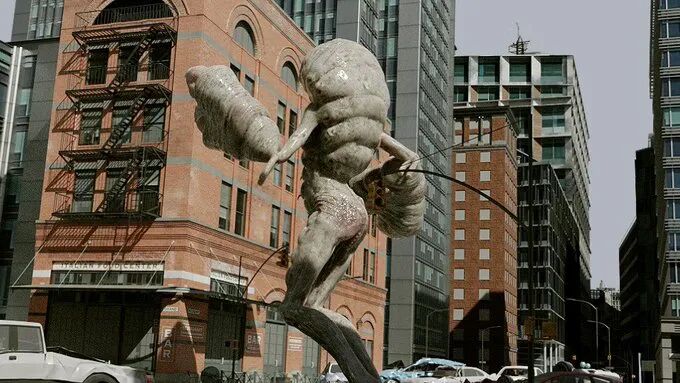安冈笃志倒是一如既往地保持创作热情,还会分享自己建模的一些细节和制作过程。比如怪兽身上的织物,还保持着粗糙的颗粒感。